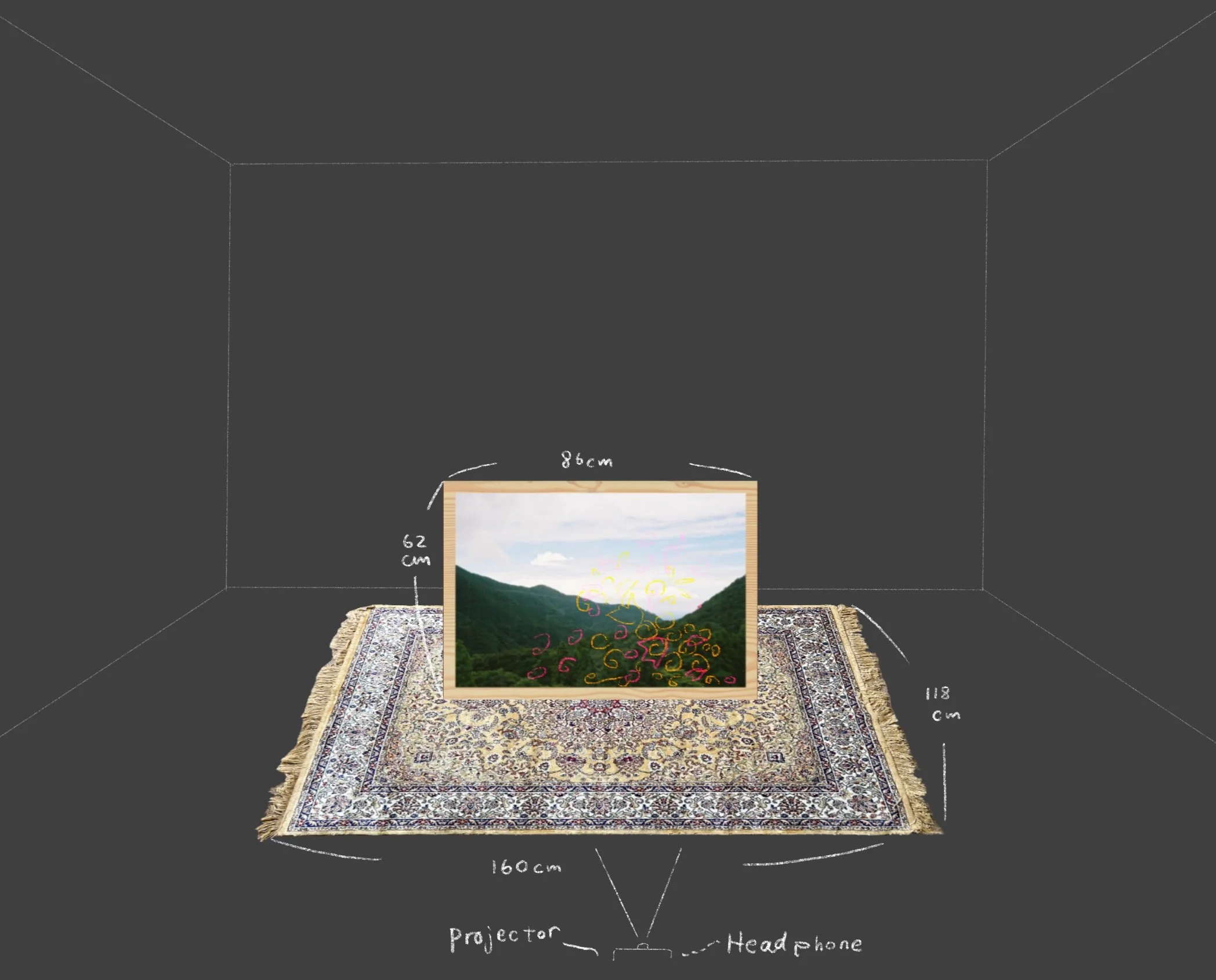 The summer show theme concerns my dual identity, encompassing Islam and Japan. I plan to design an immersive installation in a spatial dark room to portray both aspects and accurately delve into deeper thematic forms than my previous work. A central element would be a Persian rug measuring 160cm x 118cm. I need to examine how it works to create a more spacial experience. Here are some proposed ideas for the project: